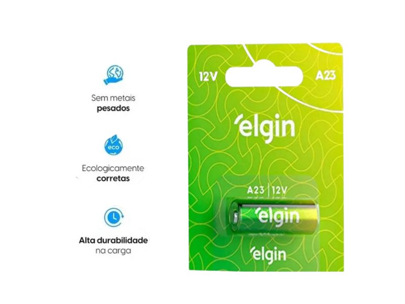 A bateria alcalina A23 da Elgin possui 12 Volts (12V) de tensão. É uma pilha de alta performance, projetada para dispositivos que exigem alta voltagem em tamanho compacto, como controles remotos de portão, alarmes e campainhas sem fio. Não é recarregável.