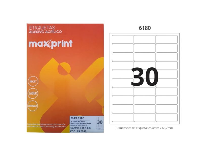 Etiquetas Adesivas em Papel Tamanho Carta para Impressora Jato de Tinta e Laser da Maxprint 25,4x66,7 Milímetros com 30 Etiquetas por Folha. Esse Pack de Etiqueta 6180 Maxprint. Contém 30 etiquetas por folhas. Em um total de 3000 etiquetas em cada caixa de 100 folhas.