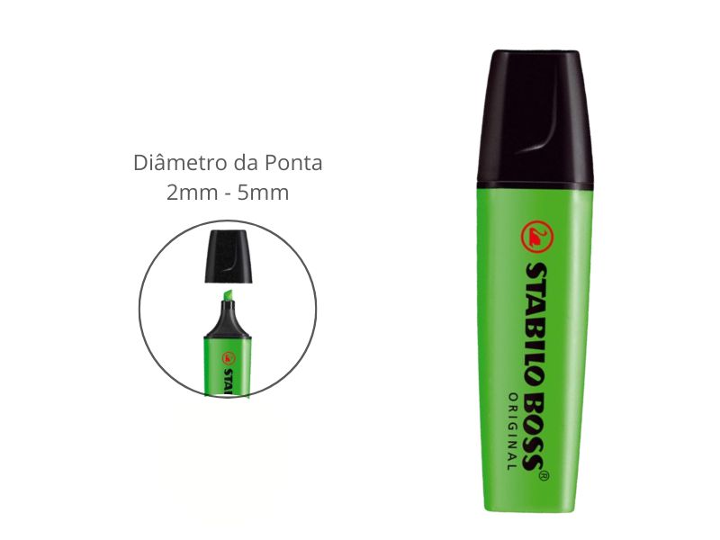 O Marca Texto Stabilo Boss Verde 70/33 é um clássico da marca. É perfeito para grifar em diferentes gramaturas de papel sem manchar o verso, graças à sua ponta chanfrada. Além de destacar, é ótimo para letterings, proporcionando duas espessuras de traço variando entre 2 a 5 mm.