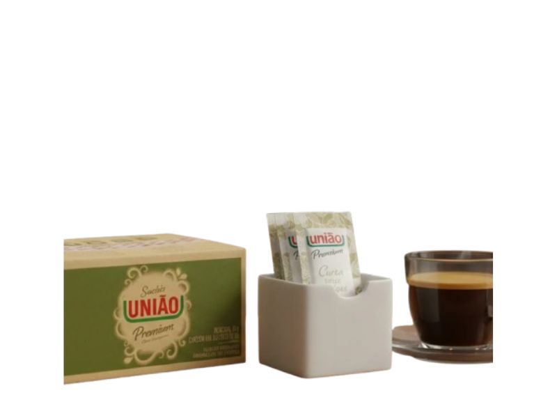 Caixa com 400 unidades de sachê Açucar União.